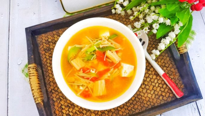 Ingredients for Low-Fat Tofu Soup: Tofu 1 block, Tomatoes 2, Enoki Mushrooms 200g, Green Pepper 1, Onion 1/8, Ginger 1…
